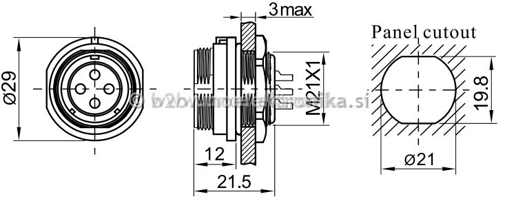 Konektor 3 polni ženski - vtičnica 3 polna fi 21mm za montažo na panel