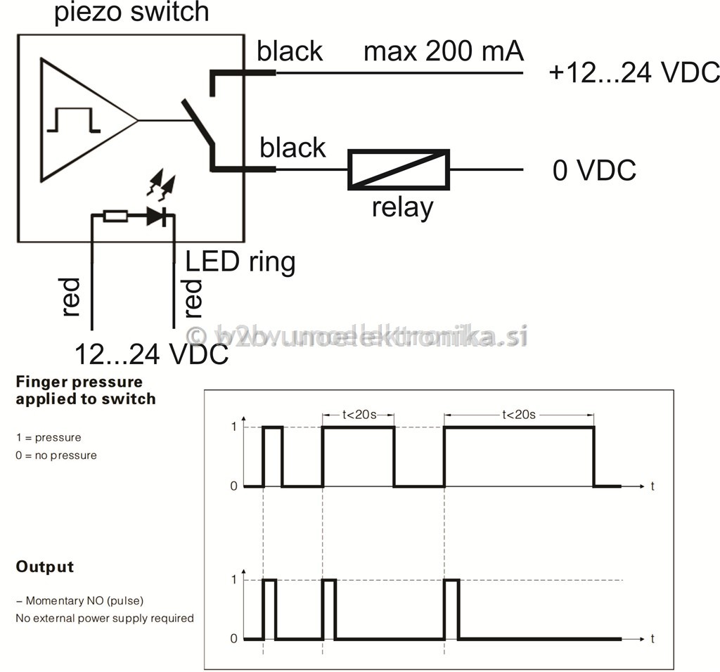 Za delovanje, je potrebno na izhodu piezo tipke, vezati močnostni koračni rele ali PLC